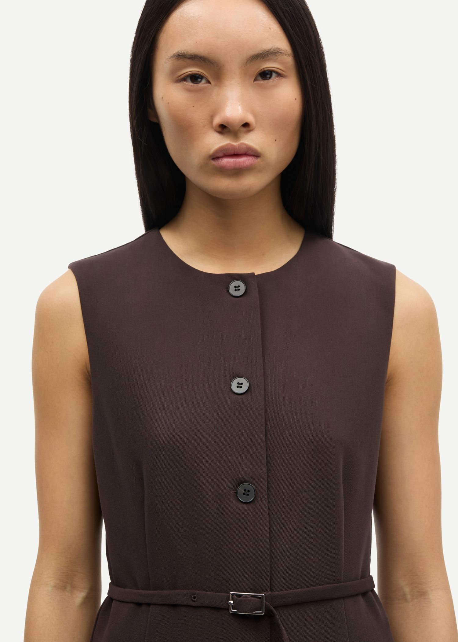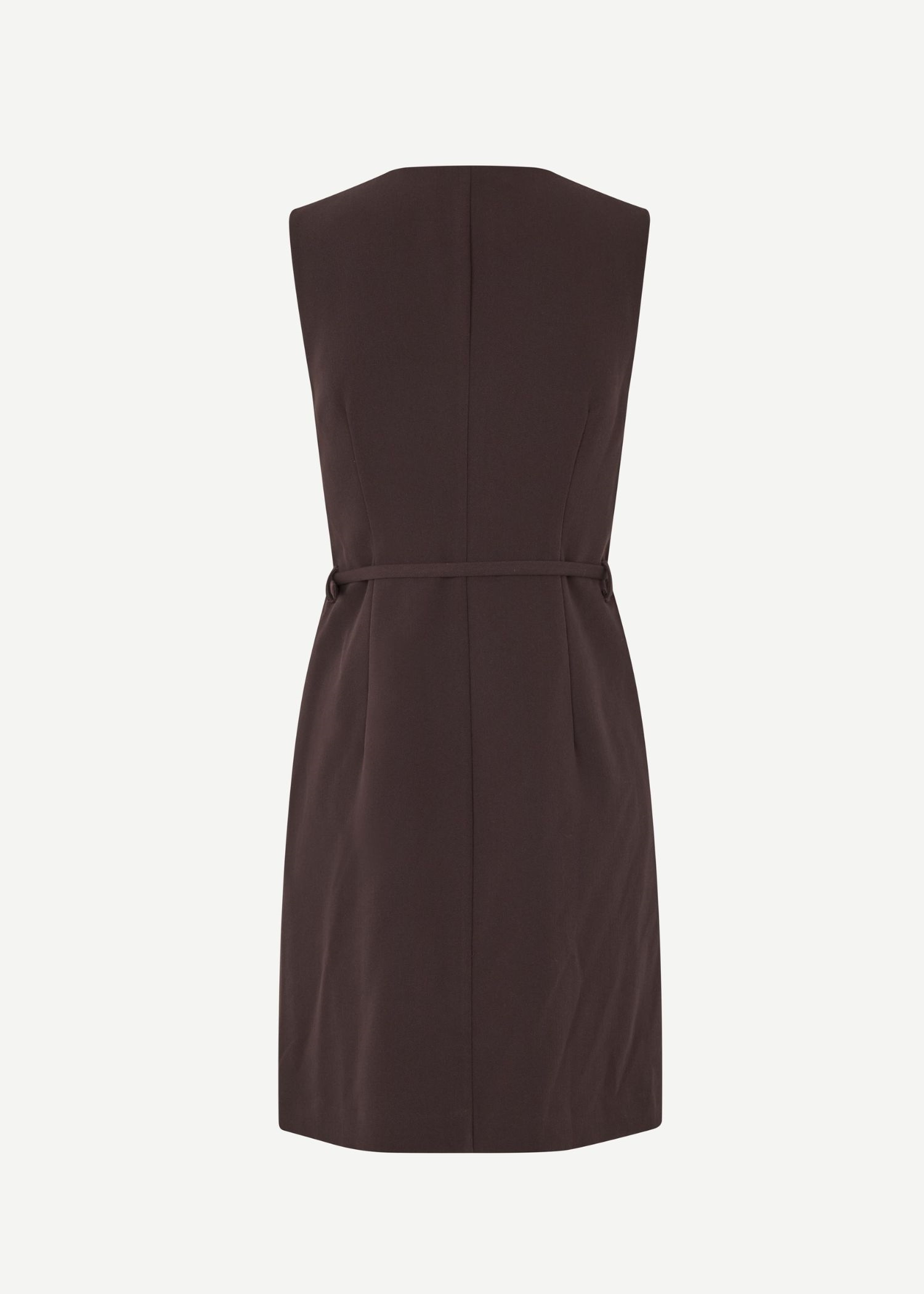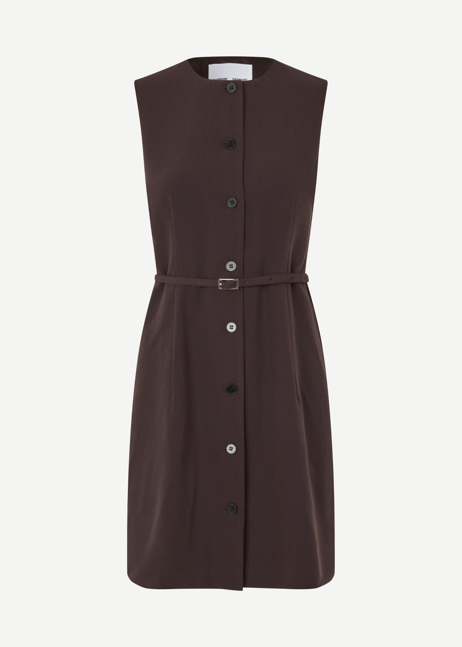 Mørkebrun kjole fra Samsøe med rund hals, gennemgående knaplukning foran, samt aftageligt bælte i taljen.