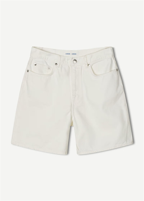 Hvide denimshorts fra Samsøe. Knap- og lynlåslukning i gylpen. Five-pocket-stil. Hovedmaterialet er fremstillet af økologisk bomuld og genanvendt bomuld.