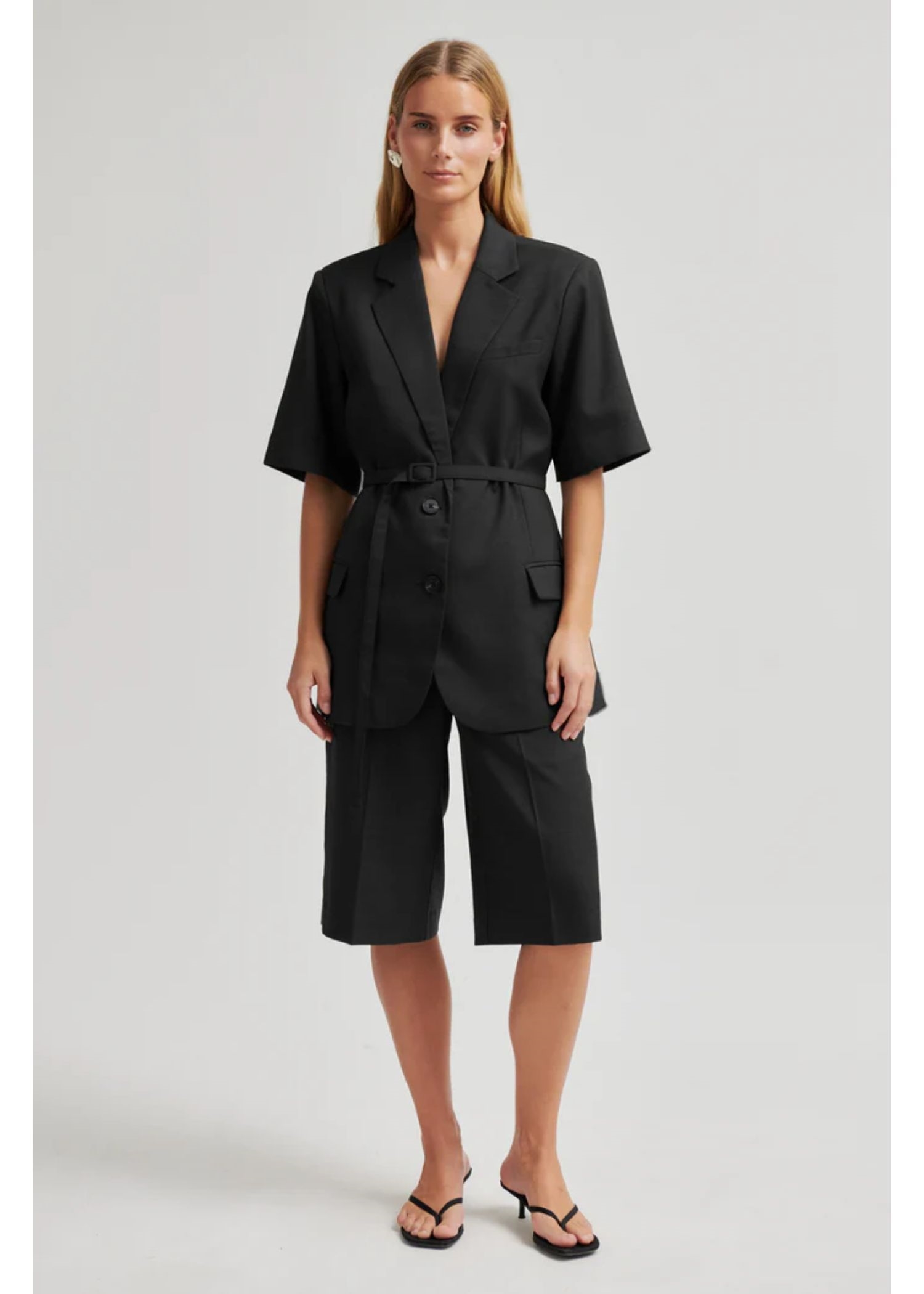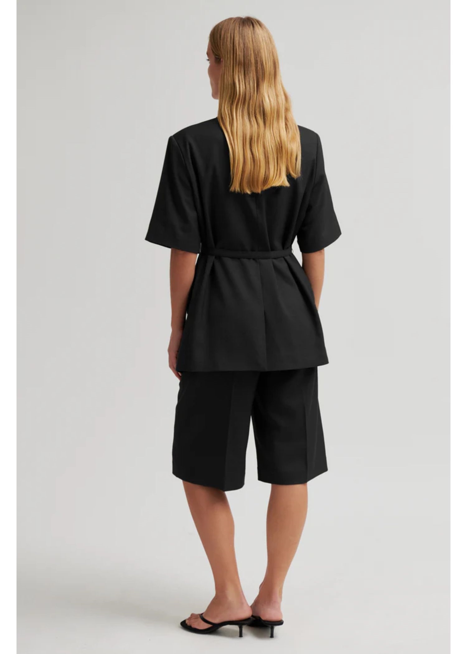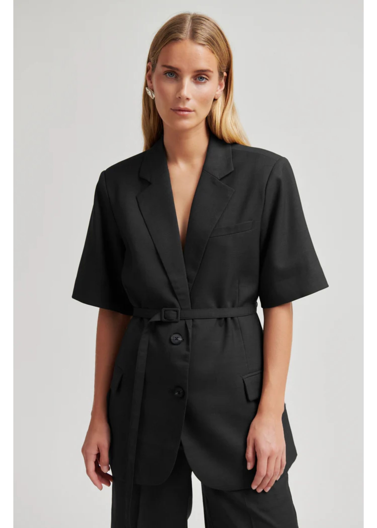 Sort kortærmet blazer fra Second Female. Blazeren er fremstillet i let materiale i let melangekvalitet. Knaplukning, stofbælte og vatterede skuldre. Klaplommer og slids bagpå. Helforet.