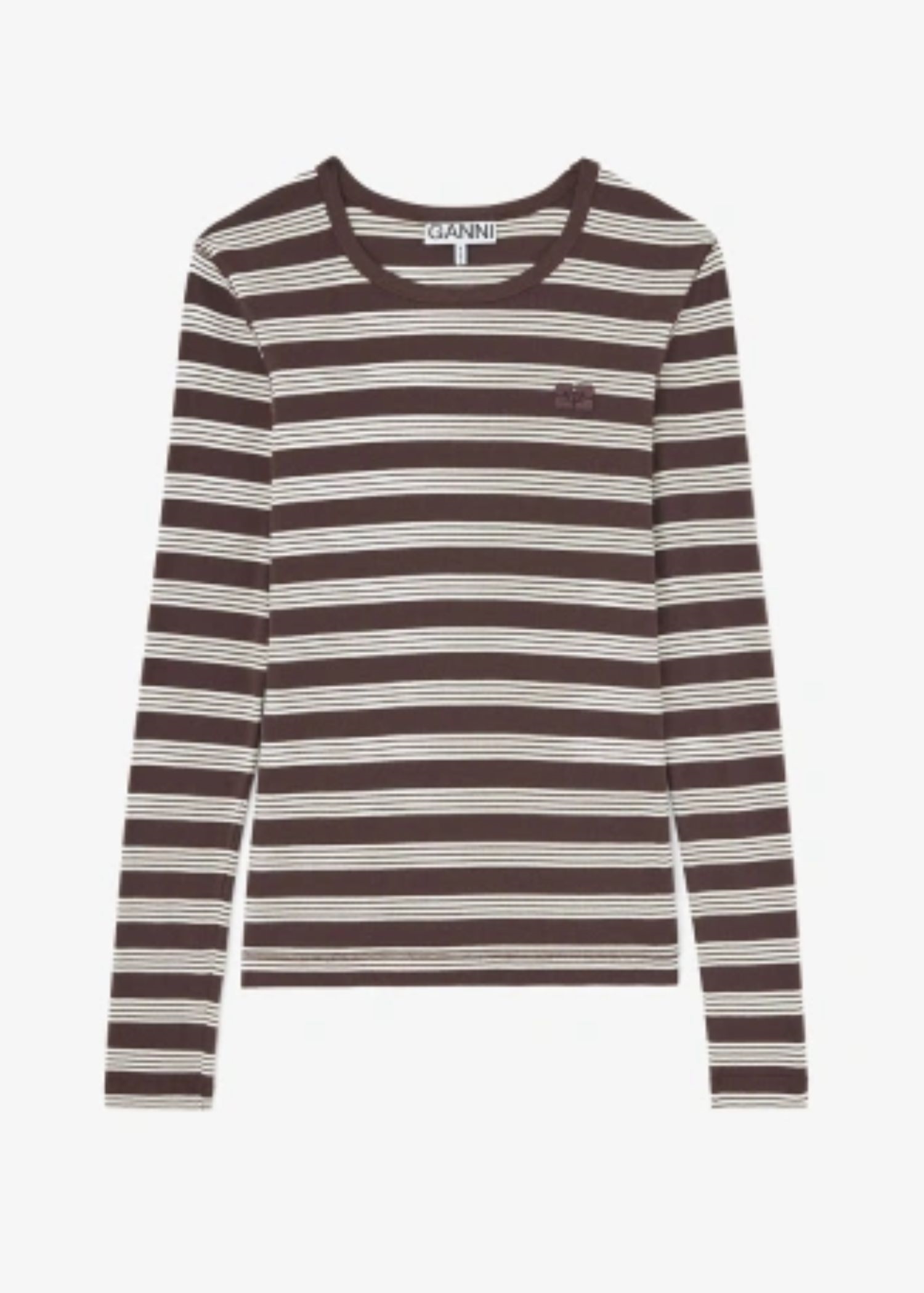 Mørkebrun/Off White stribet bluse fra Ganni med rund halsudskæring, lange ærmer og GANNI-logo.