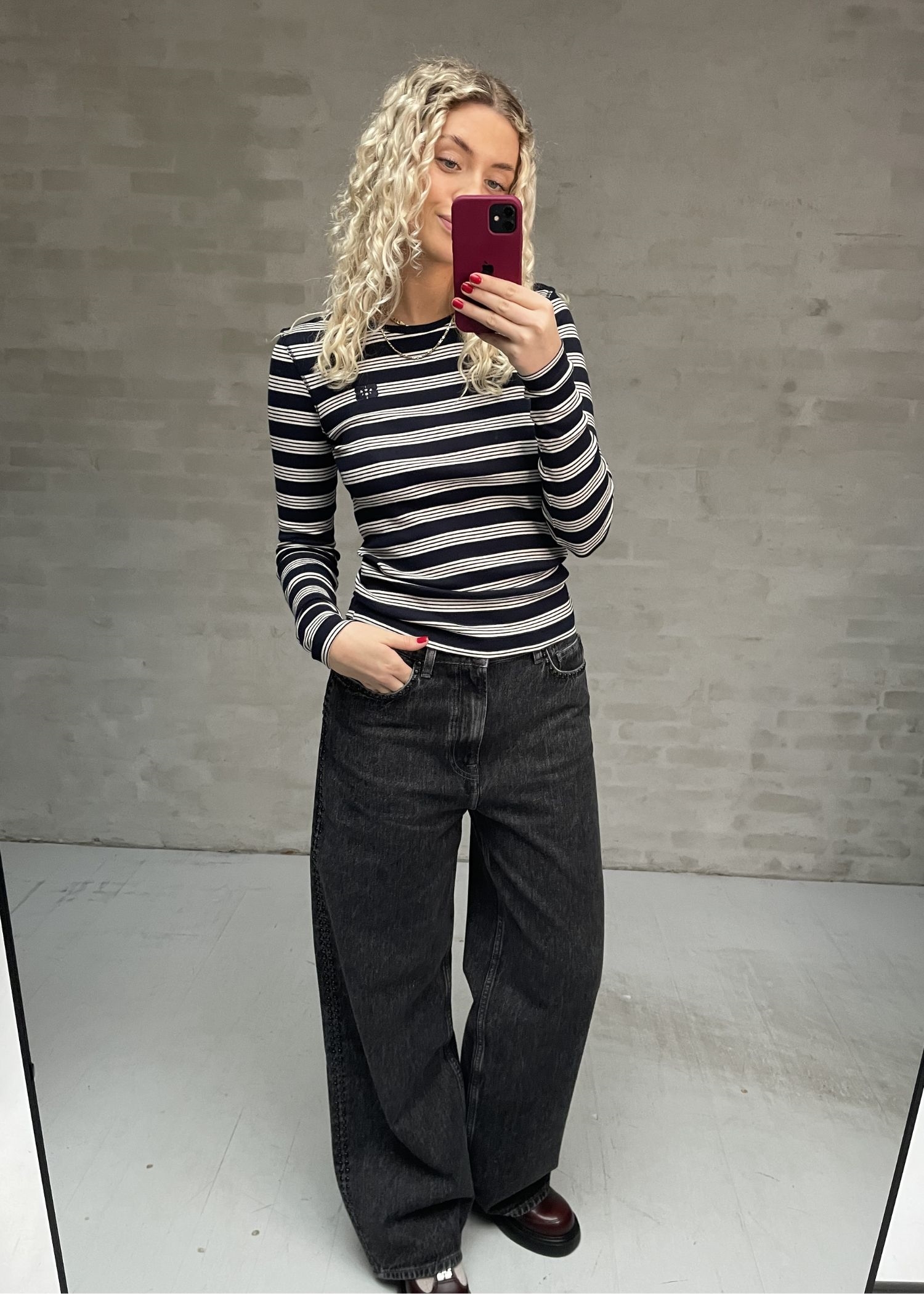Navy/Off white stribet bluse fra Ganni med rund halsudskæring, lange ærmer og GANNI-logo.