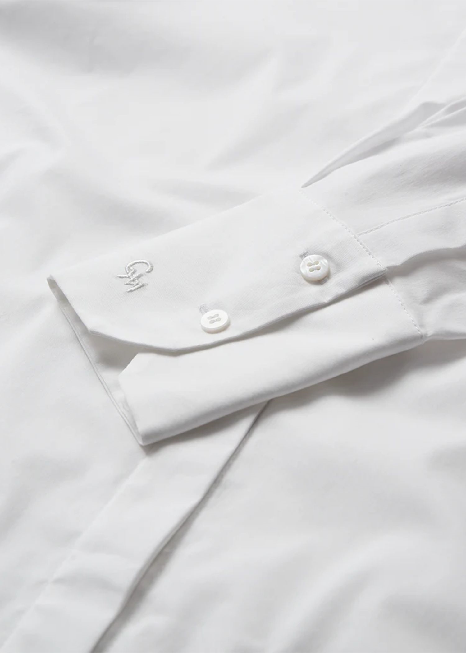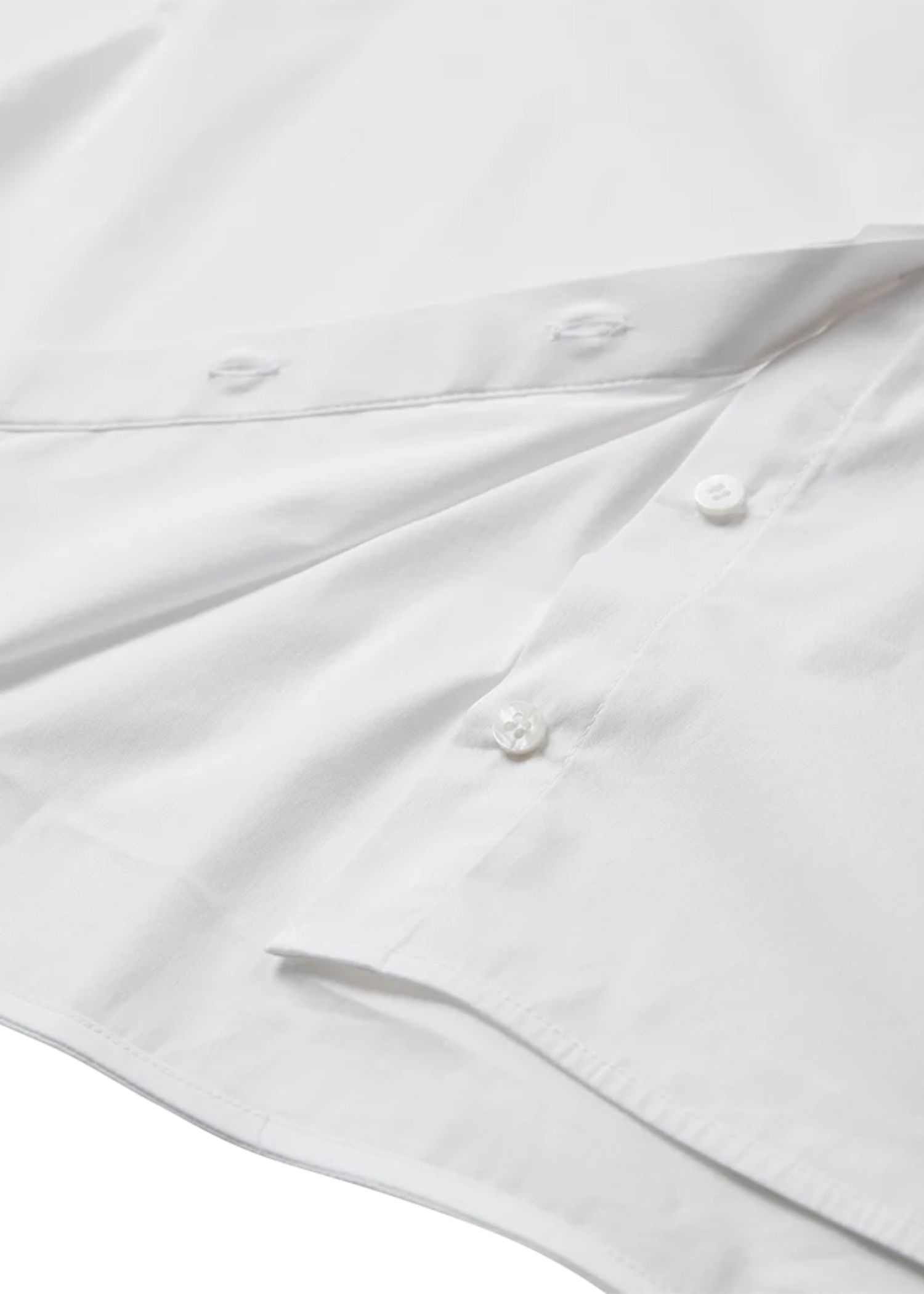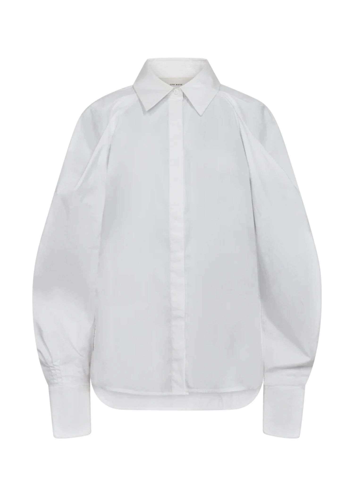 Hvid poplin skjorte fra Copenhagen Muse med krave, skjult knaplukning, lange løse ærmer med læg ved skuldre, samt knaplukning ved manchet.