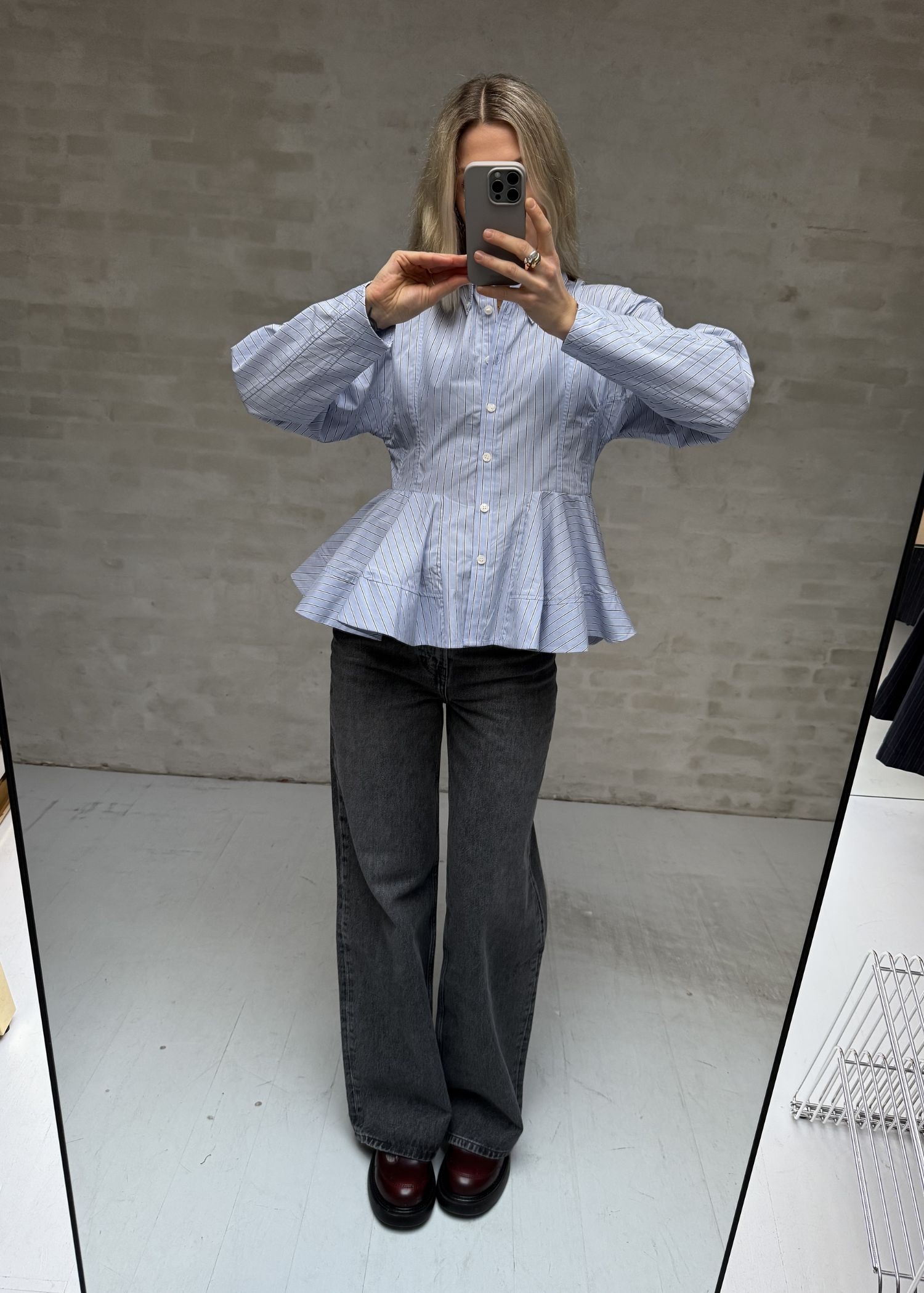 Figursyet lyseblå stribet skjorte med klassisk krave, knaplukning foran, rundede ærmer og peplumsilhuet.