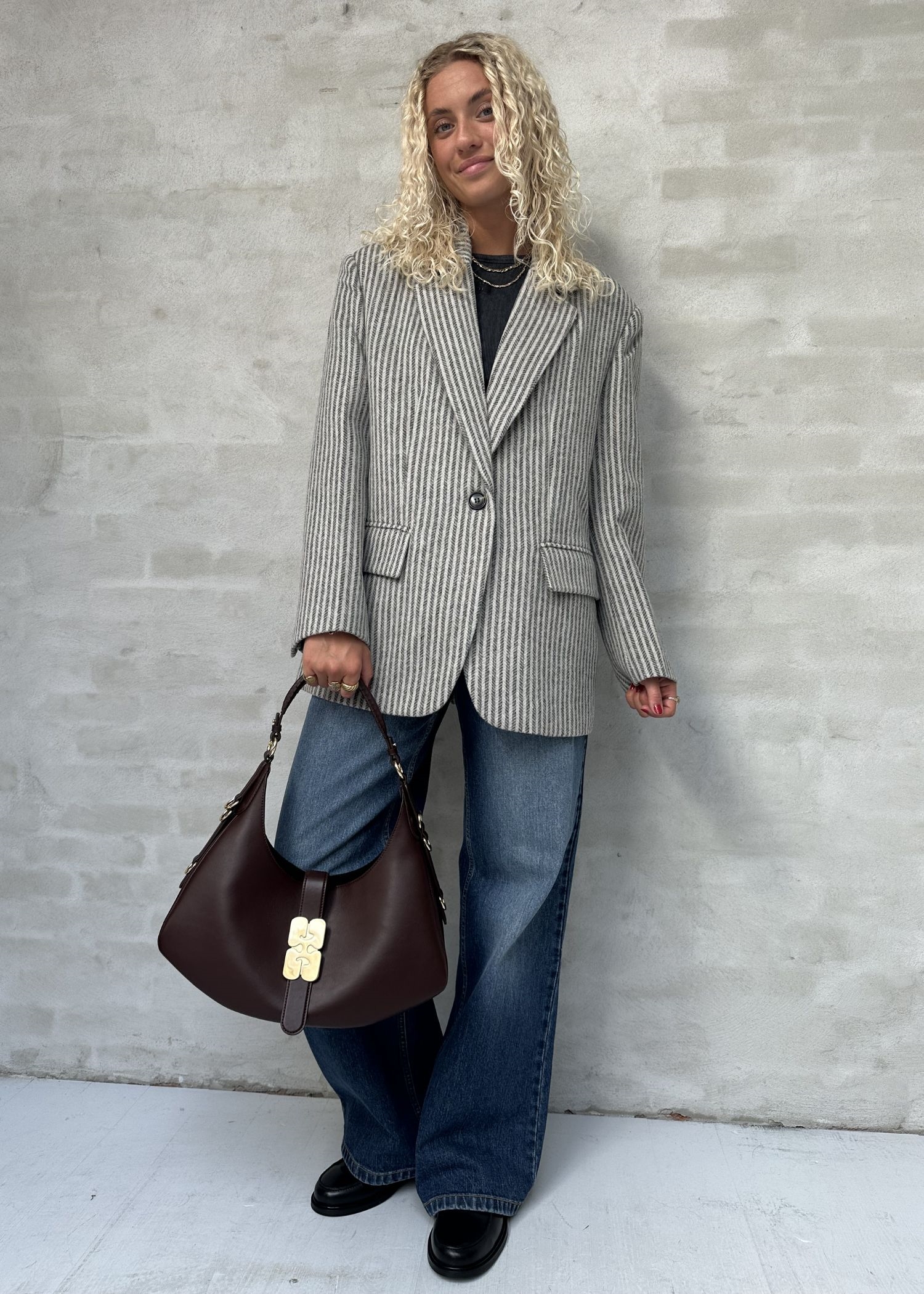Oversize sort/pudder stribet blazer fra Stella Nova med skulderpuder og lange ærmer. Blazeren har en slids bagpå, lommer i hver side og lukkes med en enkelt knap.