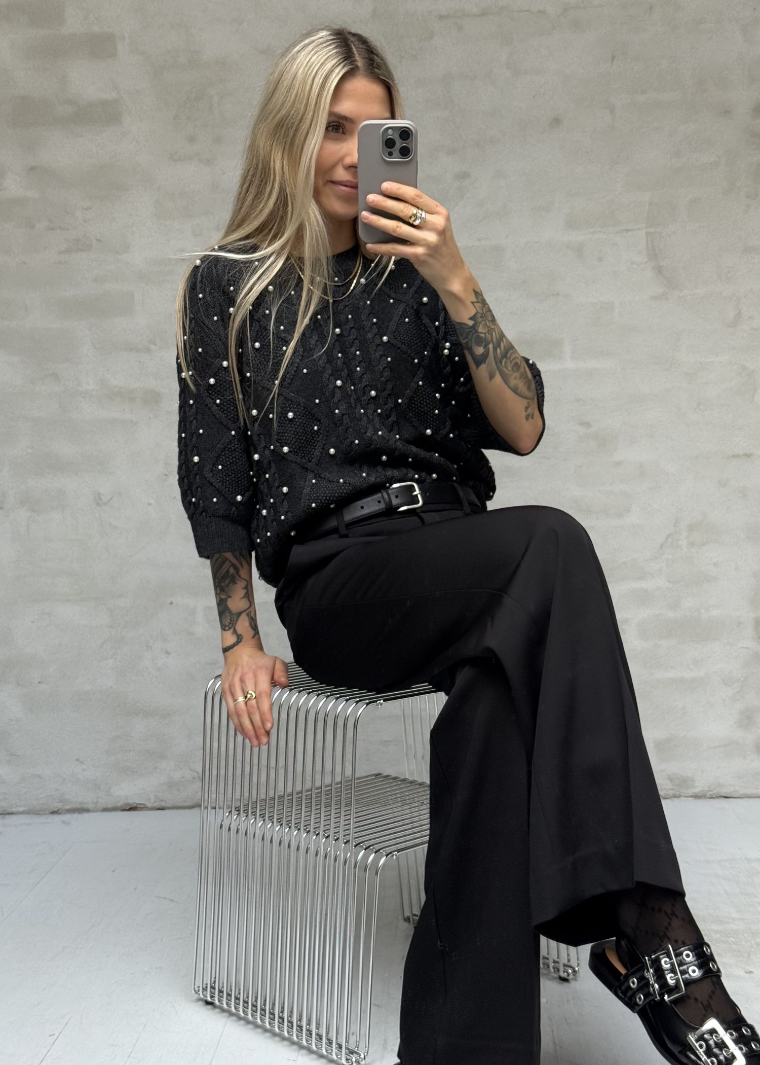 Koksgrå rovstrikket strik fra Gestuz med rund hals, albuelange ærmer og perleudsmykning. Et feminint design, der giver et fint twist til en klassisk strik