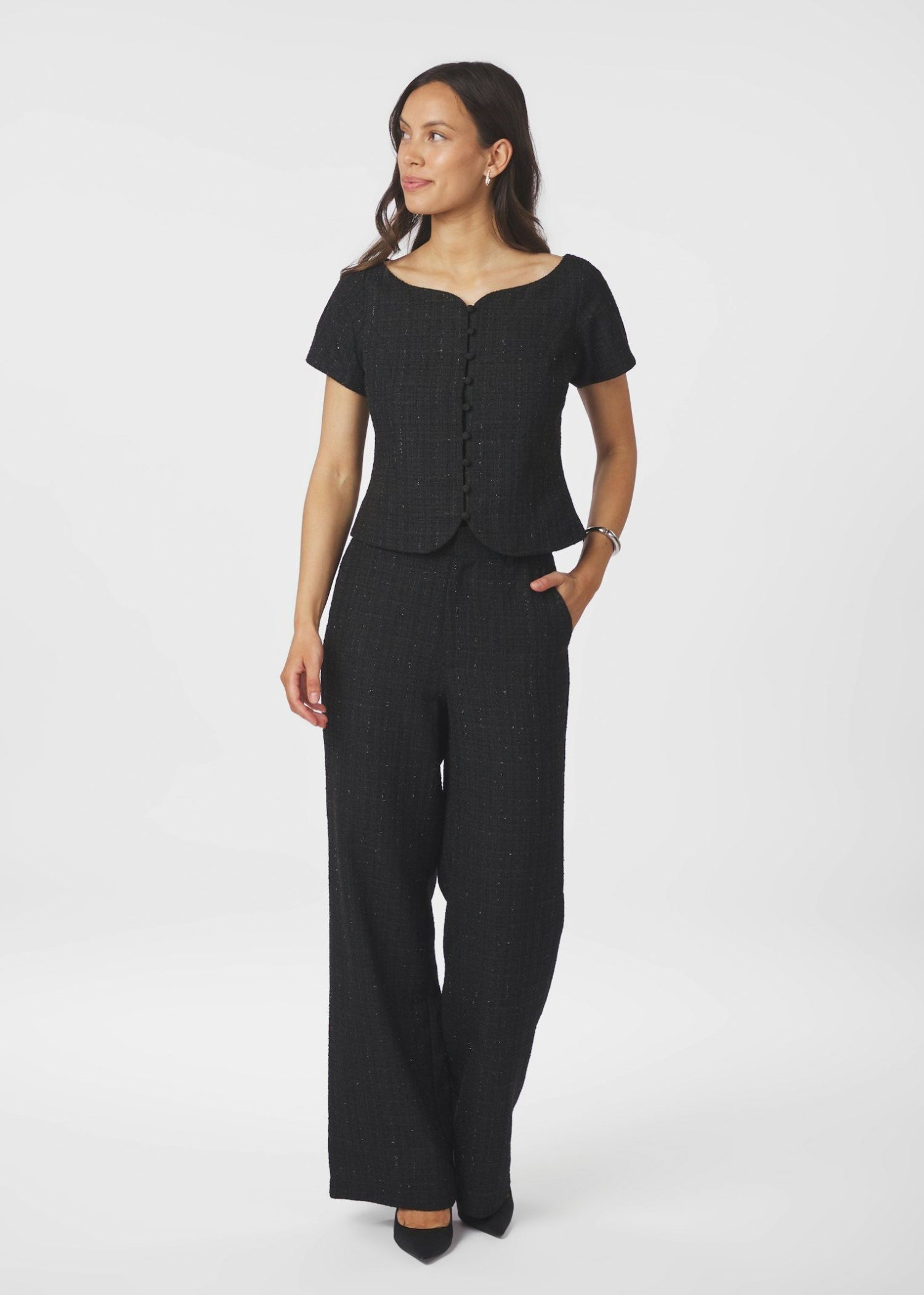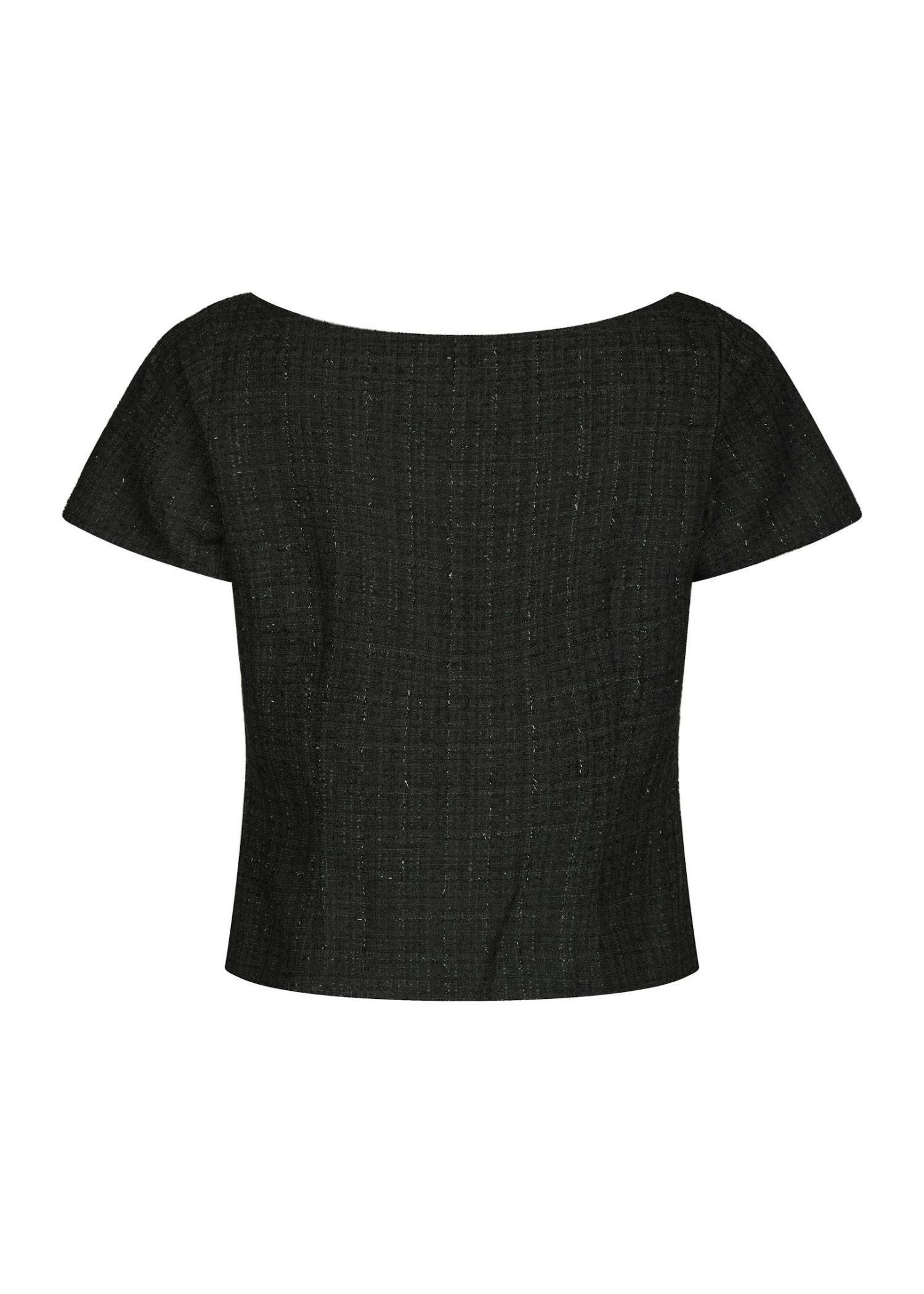 Sort boucle bluse fra Neo Noir med lurextråde i sølv. Blusen i en blød polyester kvalitet med stretch, har båd-halsudskæring, betrukne knapper foran, samt korte ærmer.