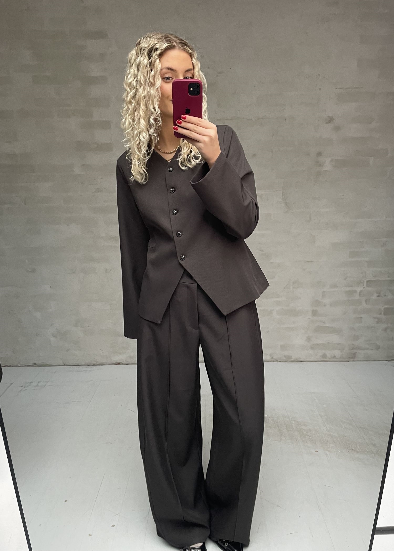 Mørkegrå buks fra Neo Noir med mellemhøj talje og bueformede ben. Bukserne har en løs pasform med pressefolder ned langs benene foran. lommer i siden, knap/lynlåslukning, samt bæltestropper i taljen.