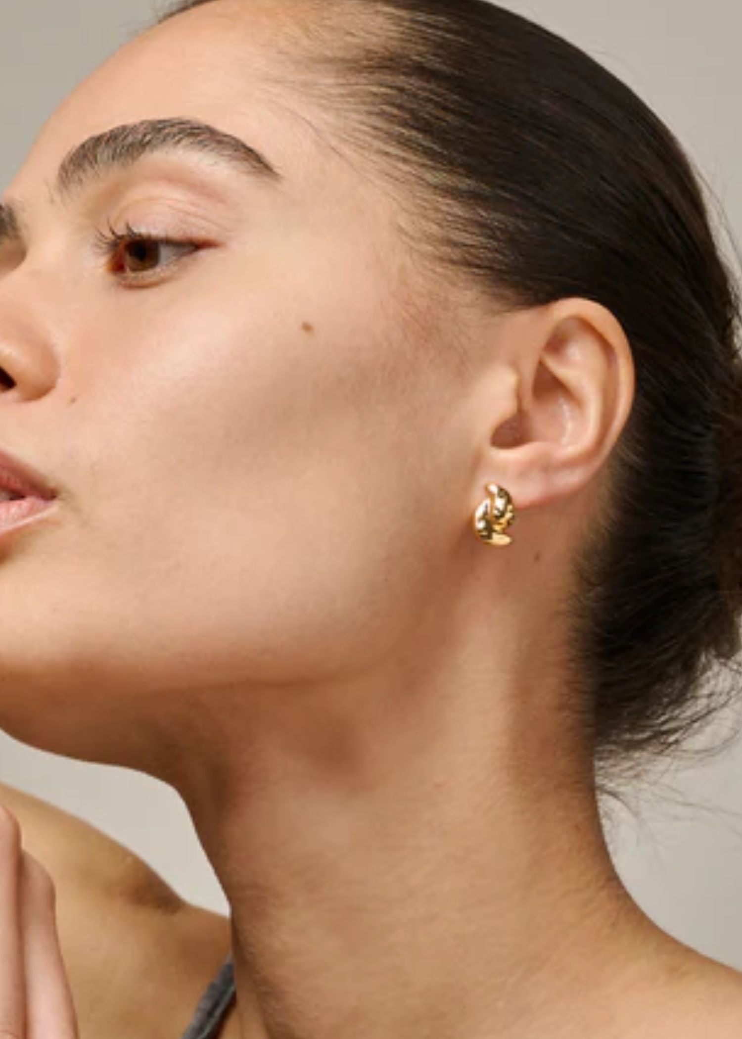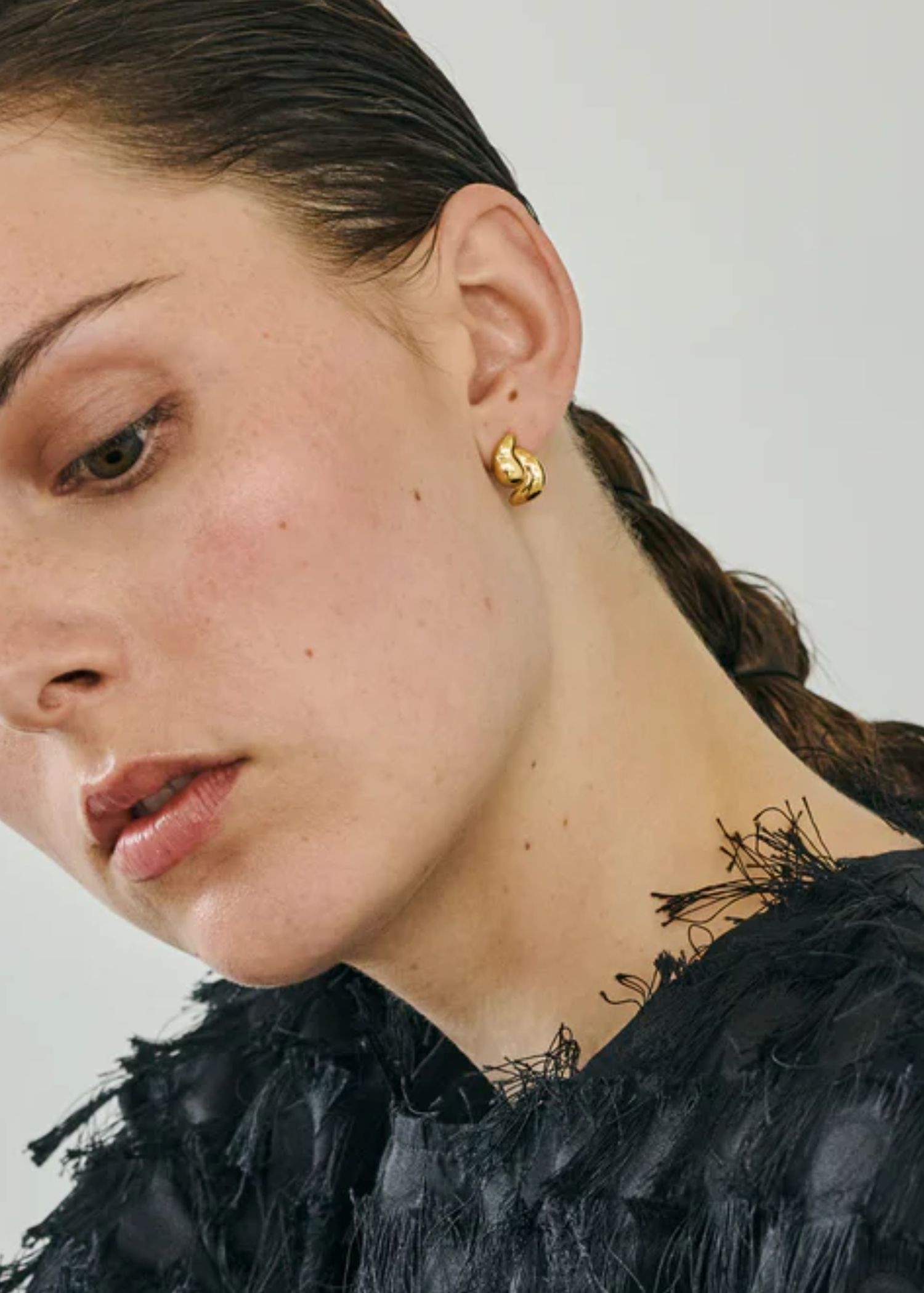 Tova Stud fra Enamel er en karakterfuld ørestik med to svungne former, der spejler hinanden i en blød, kunstnerisk bevægelse. De bølgede konturer og den blanke, organiske overflade giver smykket liv og en sanselig dybde. De to guldelementer fletter sig tæt sammen, og danner en samlet silhuet, som lægger sig elegant op ad øret, og skaber et sofistikeret, skulpturelt udtryk.