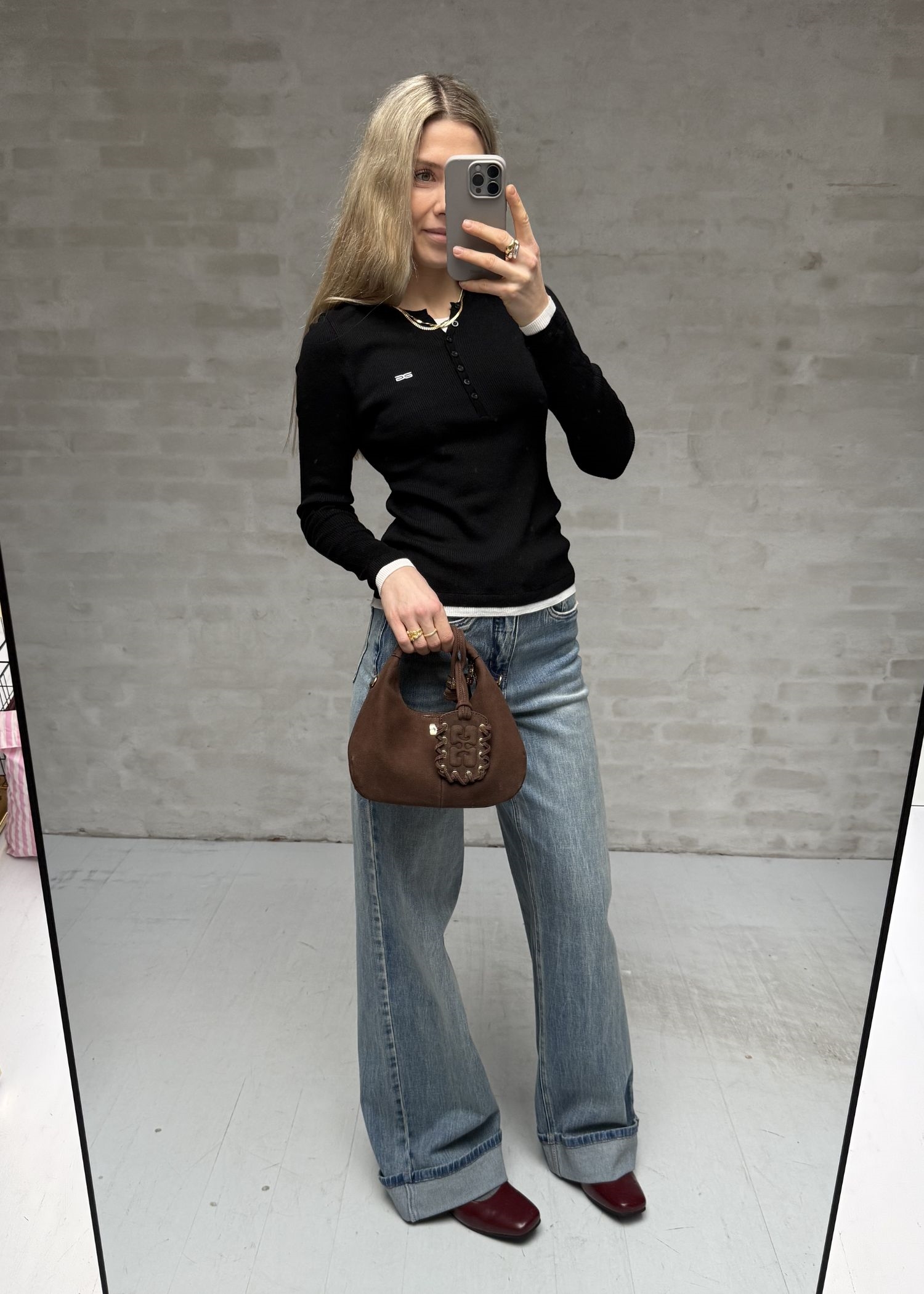 Sort rib strikket bluse fra Gestuz med stolpelukning, samt off white rib detaljer i halsen, forneden og ved ærmeafslutning.