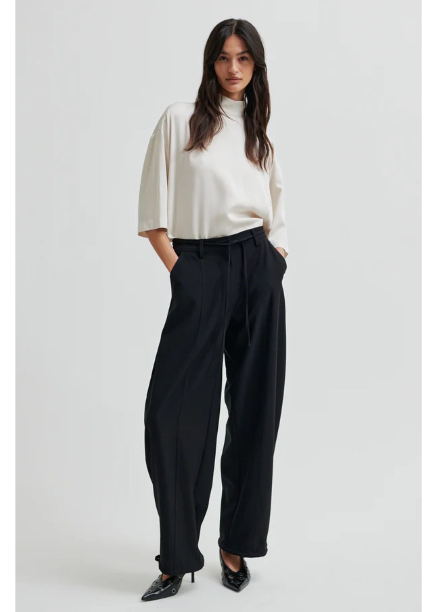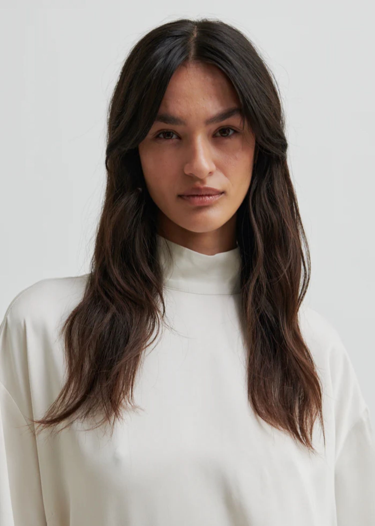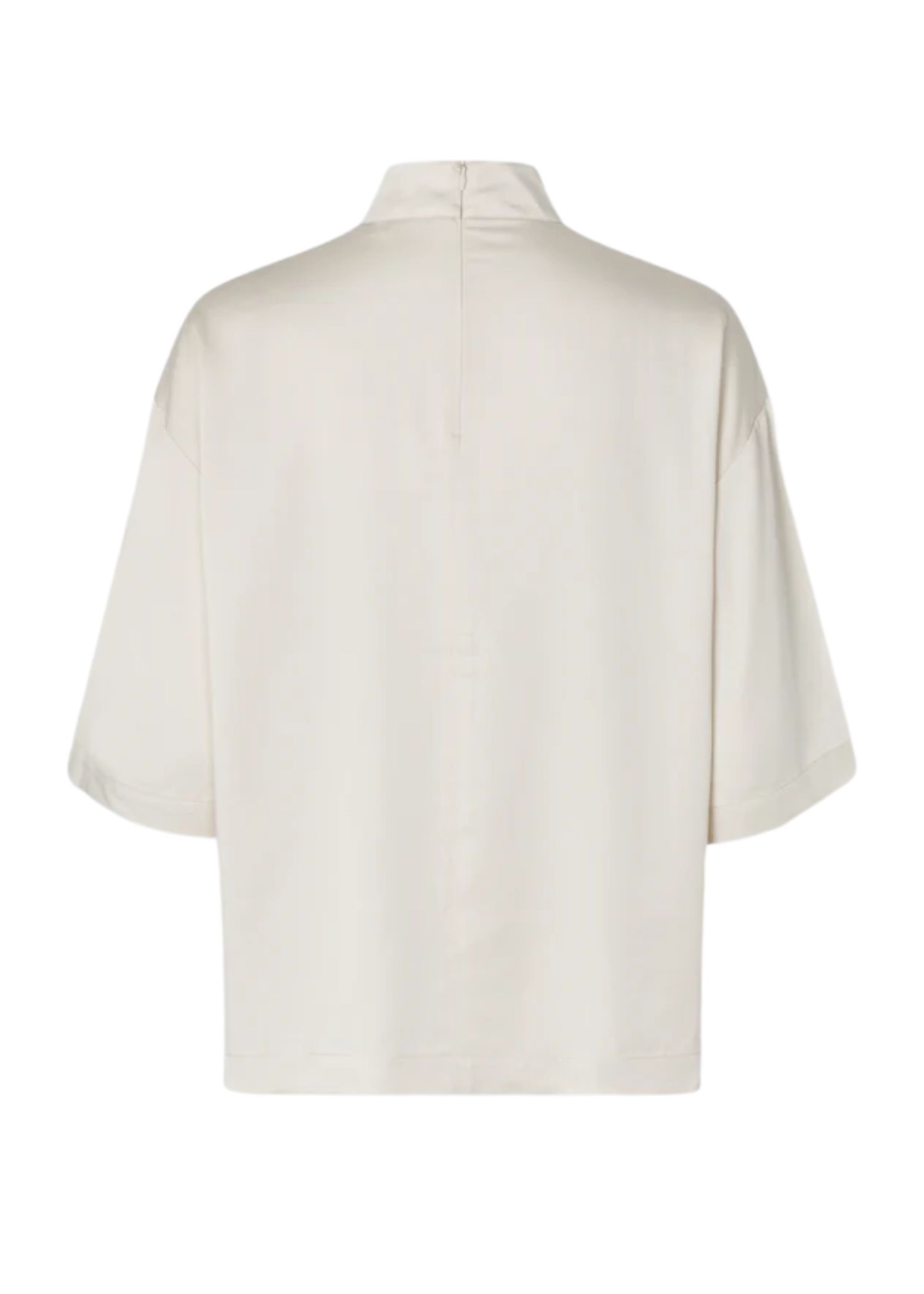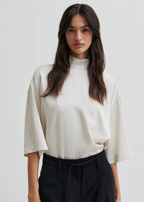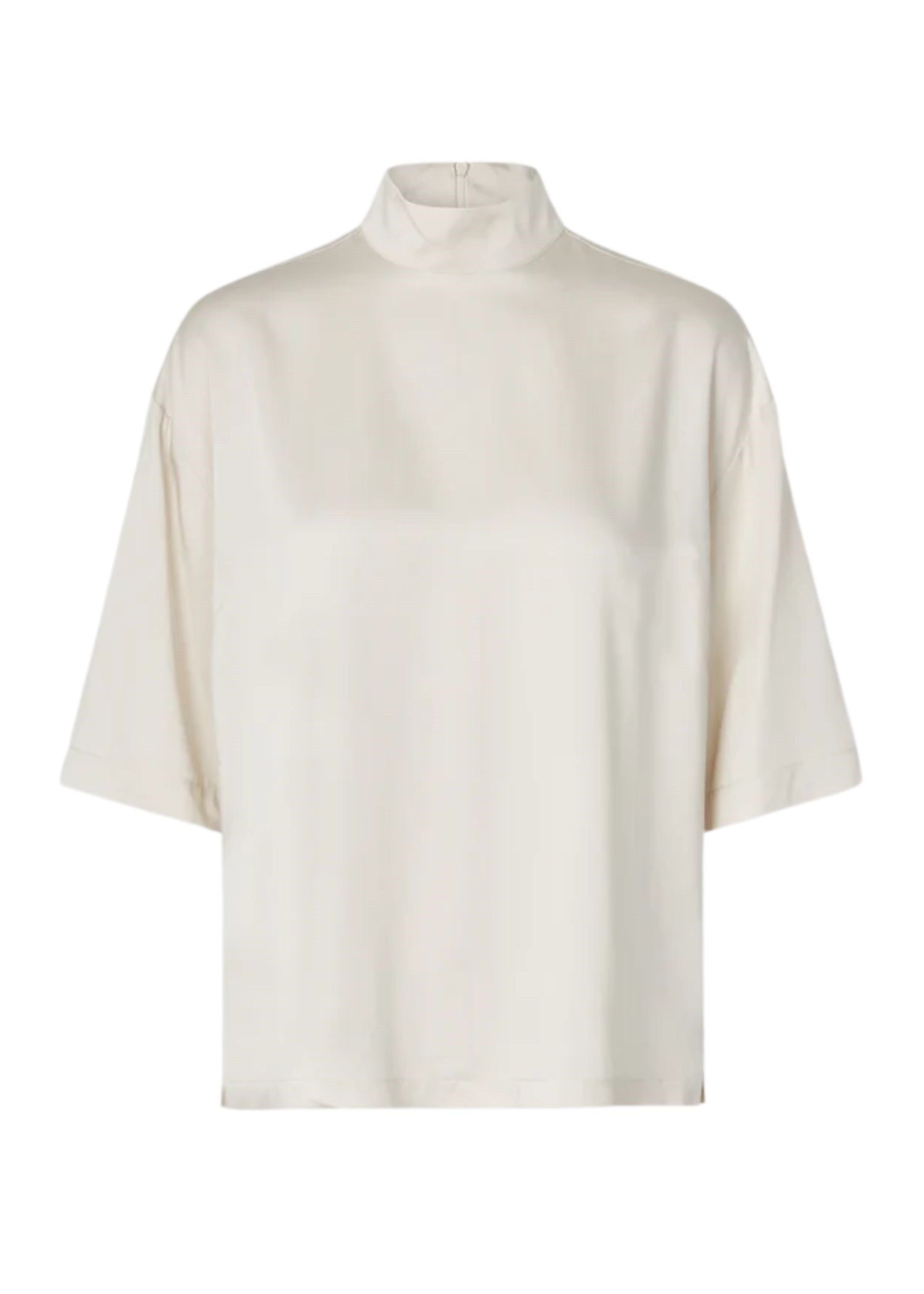 Off white bluse fra Second Female i en glat let shiny kvalitet med høj hals, 3/4 ærmer, samt skjult lynlåslukning i nakken.