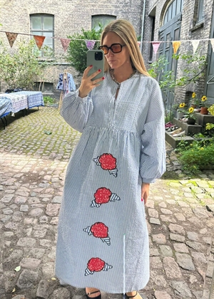 Smuk lyseblå stribet kjole fra Sissel Edelbo med røde broderede roser i en let blød bomuldskvalitet, med sidelommer, samt ballonærmer.