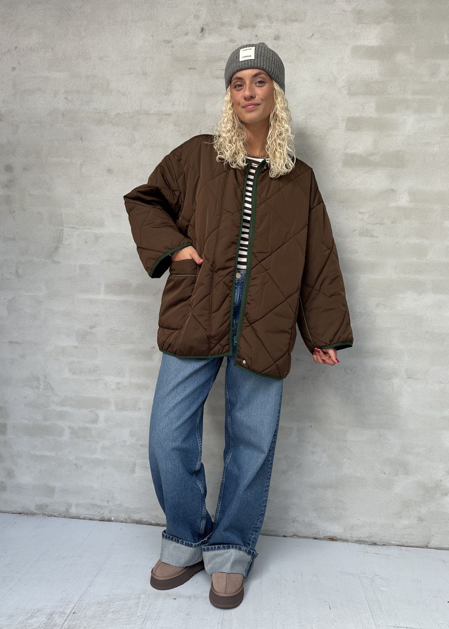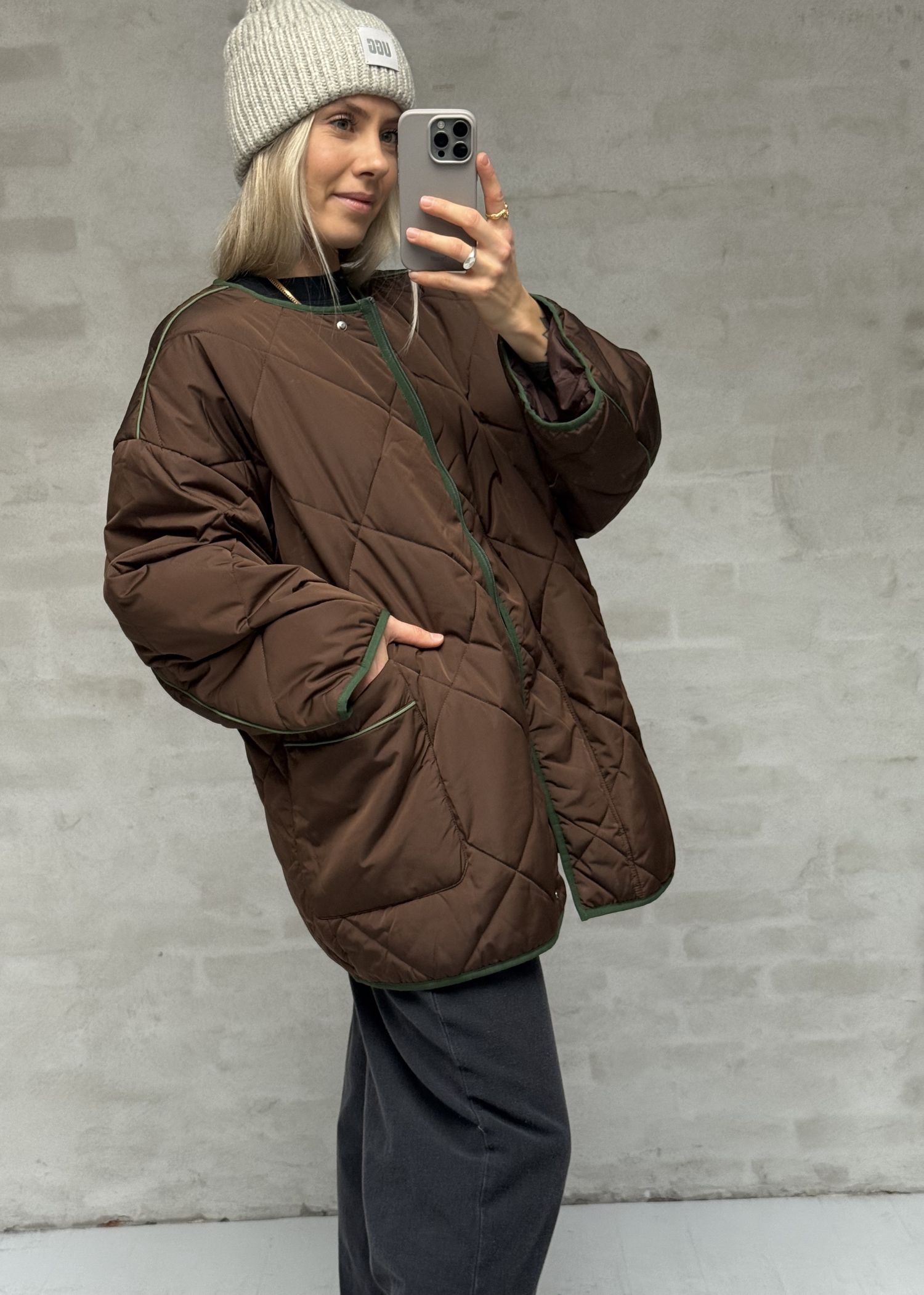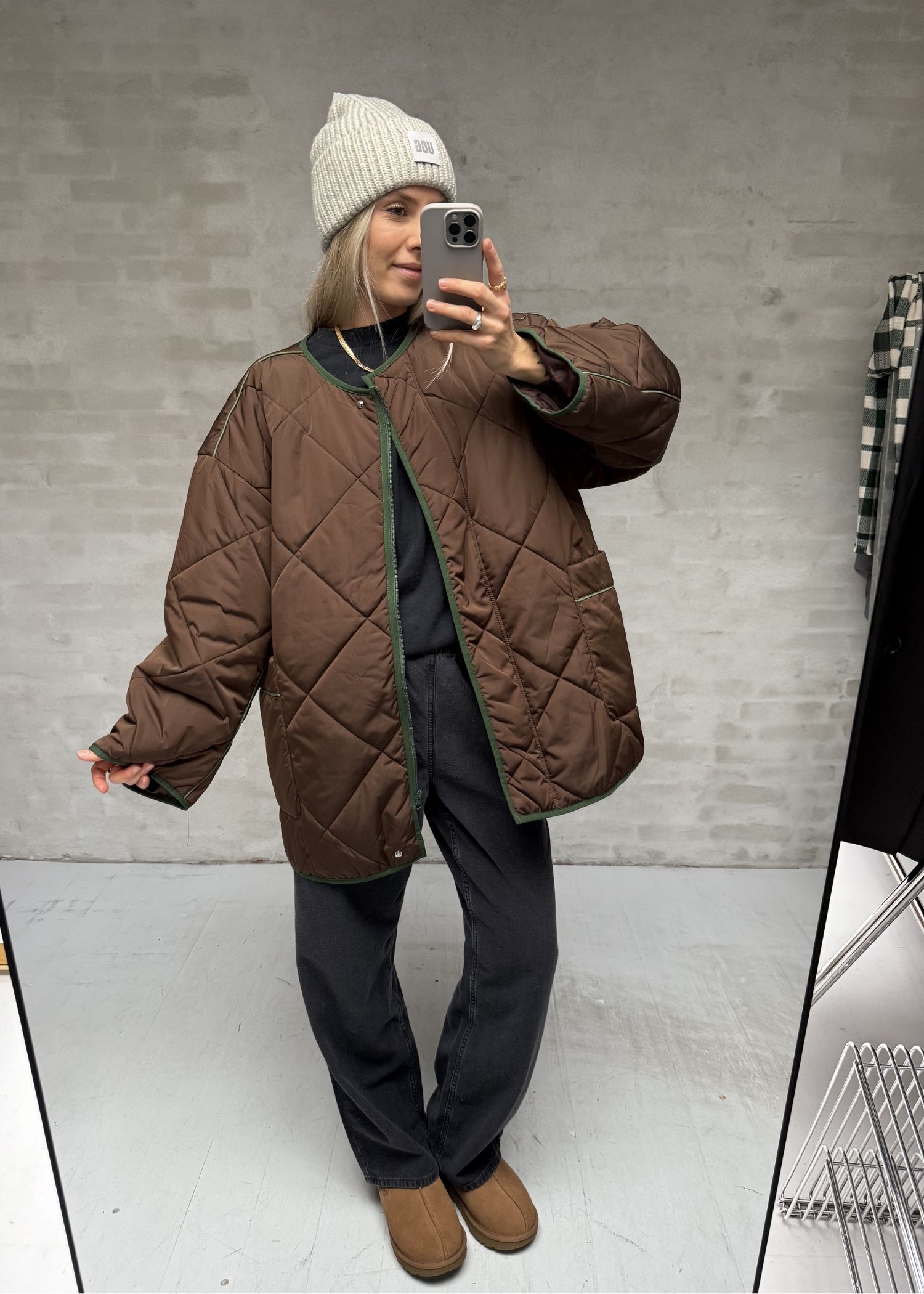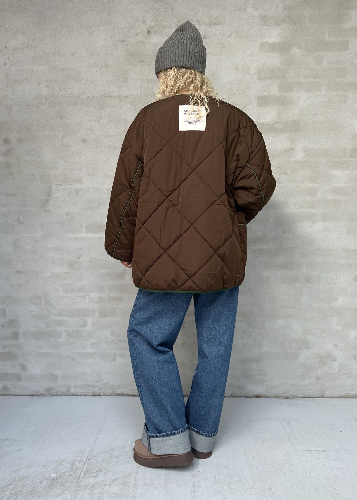 Brun quilt jakke fra American Vintage med grønne kantbåndsdetaljer i 100% polyester. Jakken har logo label foroven bagpå, er løs i pasformen, har o-hals, trykknaps/skjult lynlåslukning ned foran, samt lommer foran.