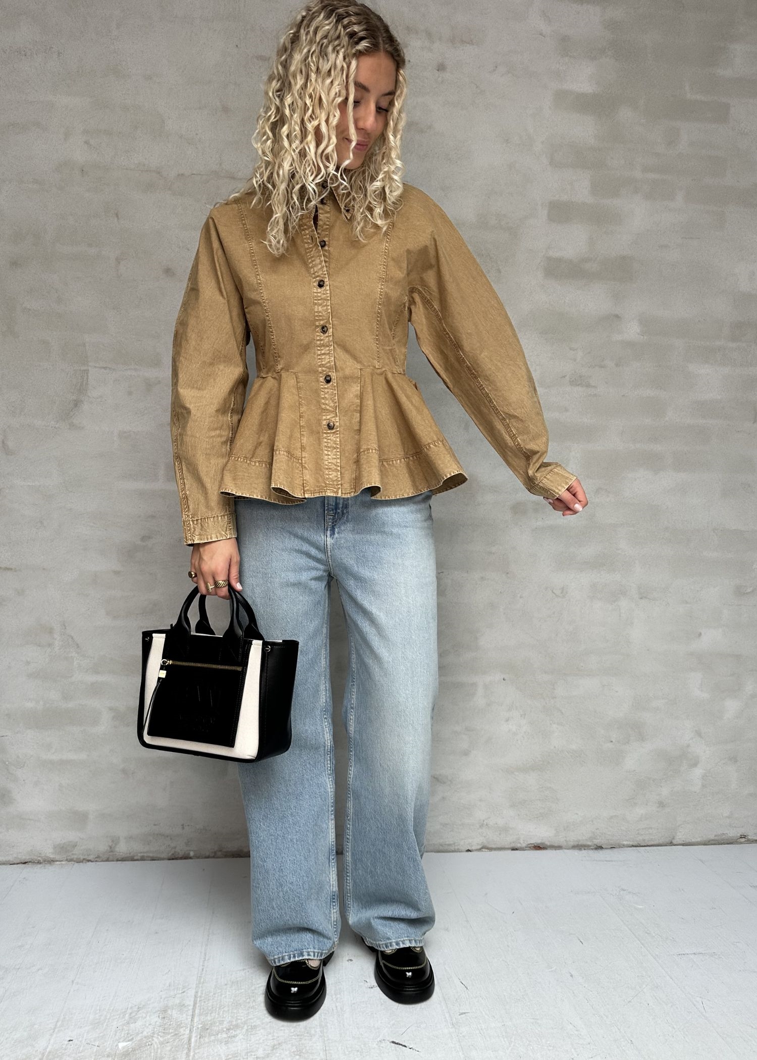 Camel farvet skjorte fra Ganni har en klassisk krave med knapper, knaplukning foran, rundede ærmer og peplumsilhuet.
