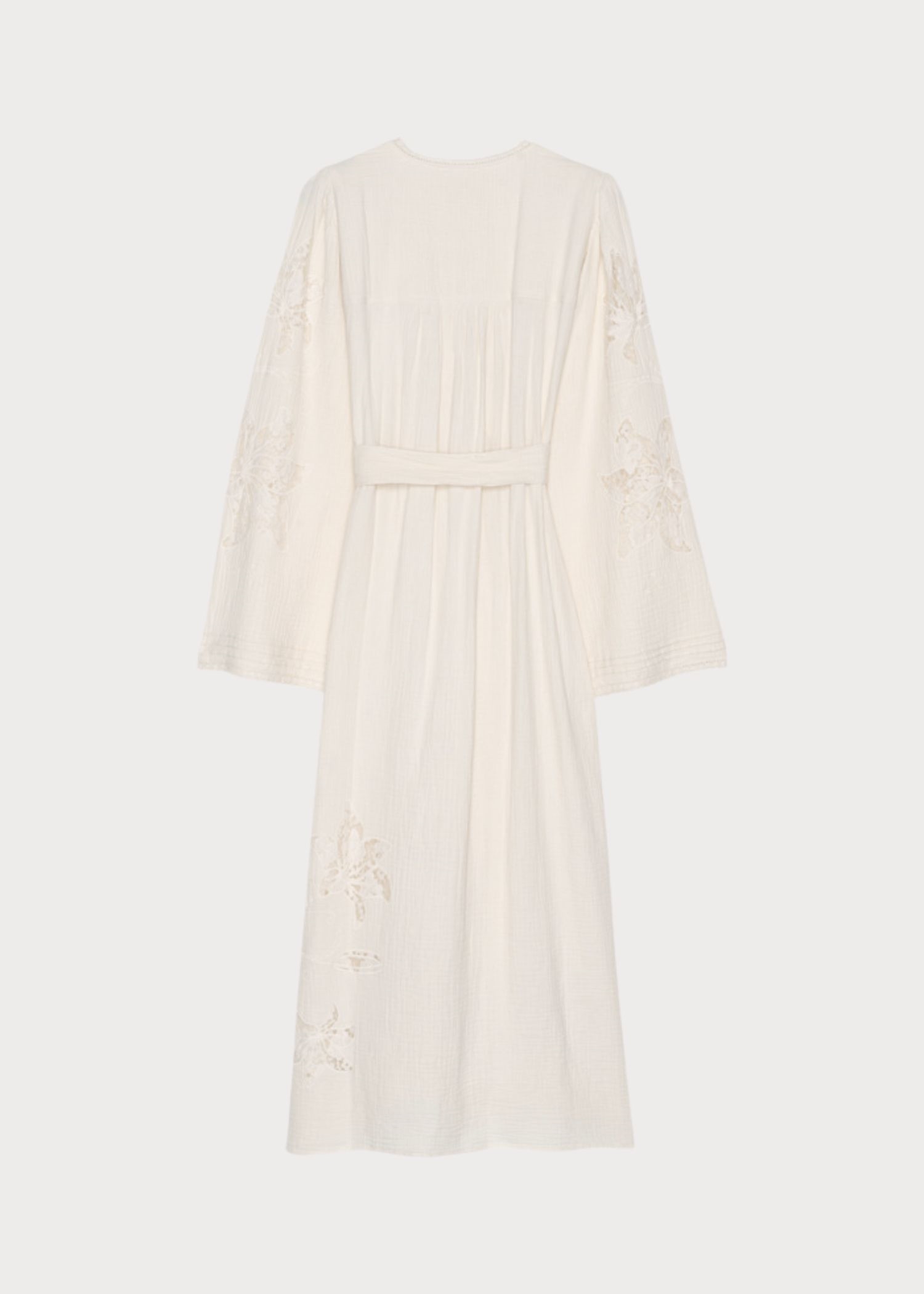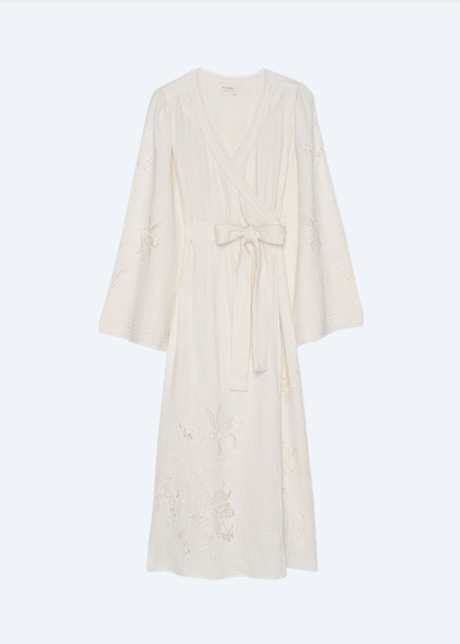 Winfrey Wrap Dress er lavet i en blød, vaffelstruktureret dobbelt gauze i 100 % økologisk bomuld. Kjolen har en feminin silhuet med slå-om-detalje og et bælte i taljen. Den har lange, udsvajede ærmer og er dekoreret med smukt blomsterbroderi placeret foran og på ydersiden af ærmerne. Halsudskæringen foran og ærmerne er afsluttet med tone-i-tone bomuldsblonde.
